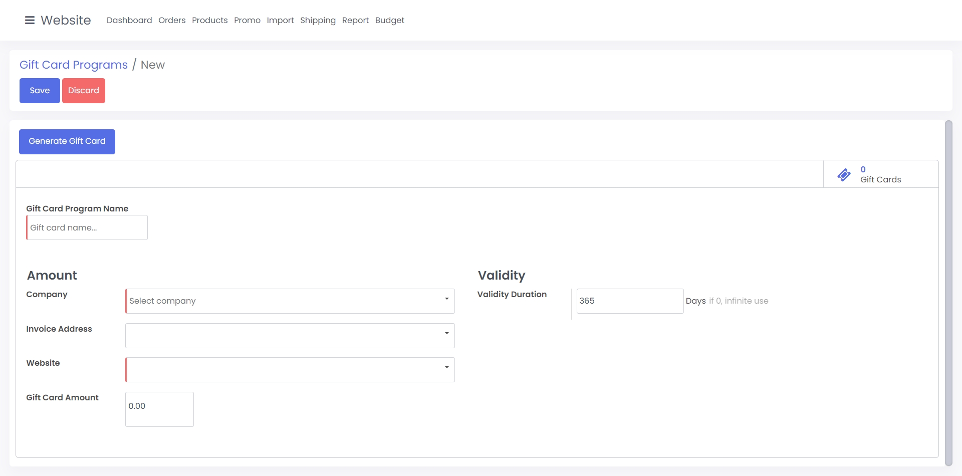 Validity Duration: This determines how long the gift card program is valid for (set to 0 for no limit)