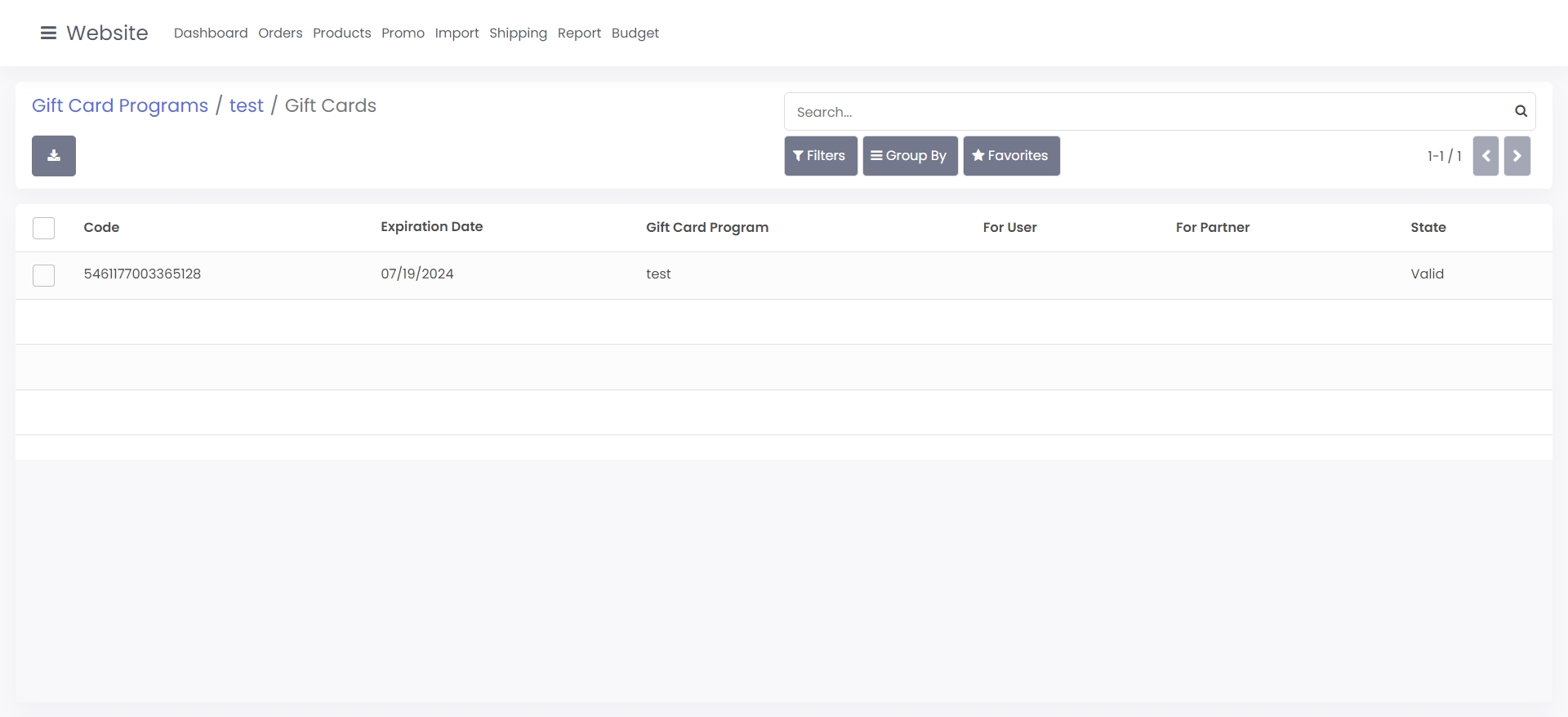 Once you're generated your gift cards, you can view them by going to the gift card program and clicking the gift cards button on the top right. From this screen, you can see the gift card code, download a report of gift cards, and assign them to specific users.