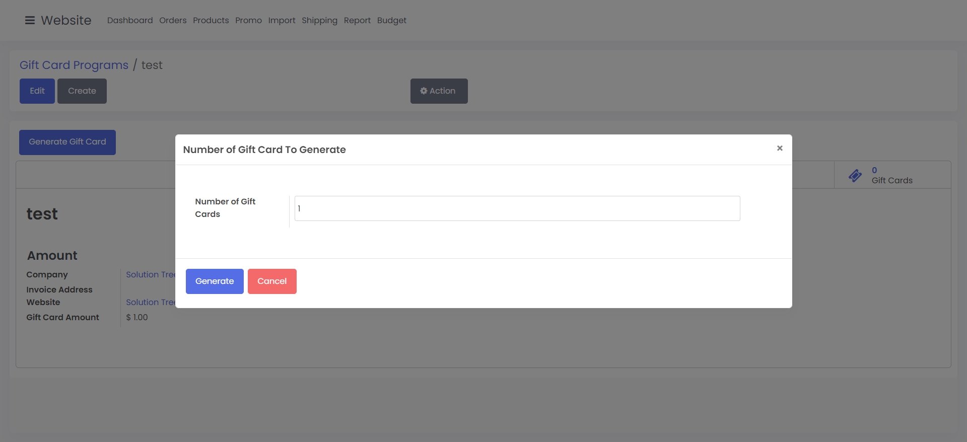 After clicking "Generate Gift Card", you'll see a pop-up window where you can enter how many gift cards you want to generate. Type in the number you'd like then click "Generate"